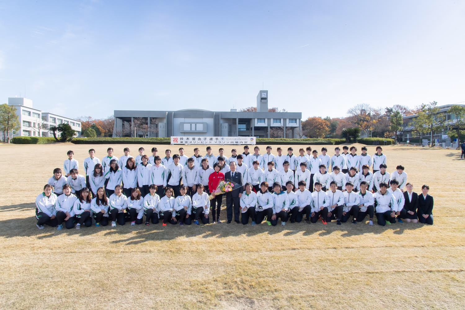 12/15(日)に名古屋大学経済カンファレンスホールでH26年度卒のOGの鈴木亜由子さんの壮行会が行われました。鈴木亜由子さんは9/15(日)に行われたMGCで2位に入り、東京オリンピックの女子マラソンの日本代表に内定されています。壮行会には松尾清一総長や元監督の金尾洋治氏、経済学部のOB会であるキタン会の鈴木武会長、JP日本郵政グループ女子陸上部監督の髙橋昌彦氏も出席されました。