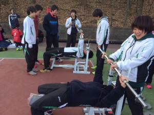 初めに、講義室にて「レジスタンストレーニング基礎理論」という題目で講義を行っていただきました。ウェイトトレーニングの基礎理論や効率のよいトレーニング計画の立て方を、運動生理学の実際のデータを見ながら学びました。講義後は全員で山の上に移動して、スクワットとベンチプレスを中心に実習を行いました。先日新調したばかりのウェイト器具を使って、一つ一つ丁寧に教えていただきました。