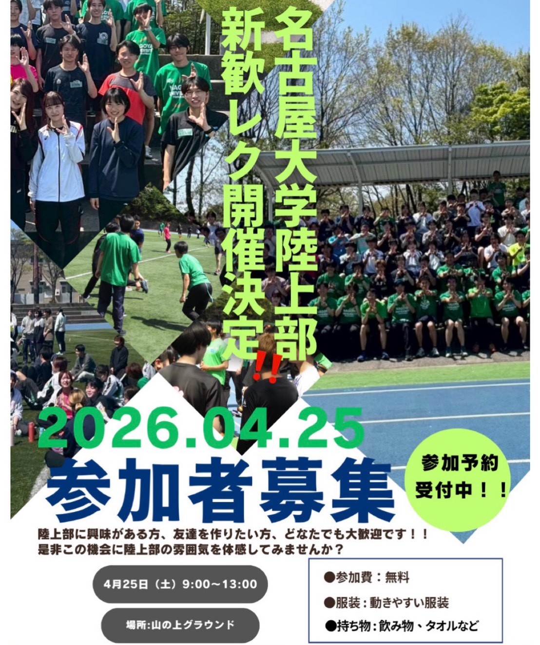 ホーム 主要大会のお知らせ 日本学生個人選手権 4月24日(金)~26日(日) 平塚 大会要項掲載 東海インカレ 5月7日(木)~9日(土) 瑞穂2026.4.5 大会要項掲載 主要大会結果 信大戦 3月29日(日) 知多2026.4.5 男女とも優勝 日本学生競歩選手権 3月15日(日) 能美(石川) 鈴木智大(D2) 日本インカレ・個人選手権標準突破 新着記事 【大会情報】鈴木智大(D3)が5000mWで名大新 2026.4.12 名古屋地区春季第2回 4月11日(土)~12日(日) 瑞穂 その他大会 【結果】名古屋地区春季第2回 4月11日(土)~12日(日) 瑞穂2026.4.12 鈴木智大(D3)が5000mWで名大新 新入生・高校生の皆様 新歓レクを山の上グラウンドにて開催します。是非ご参加ください。参加申し込みは画像をクリック↓ 山の上陸上競技場へのアクセス 新入生・高校生の皆様向けに新歓サイトを開設しています。是非ご覧ください。 問い合わせ先 メールフォーム
